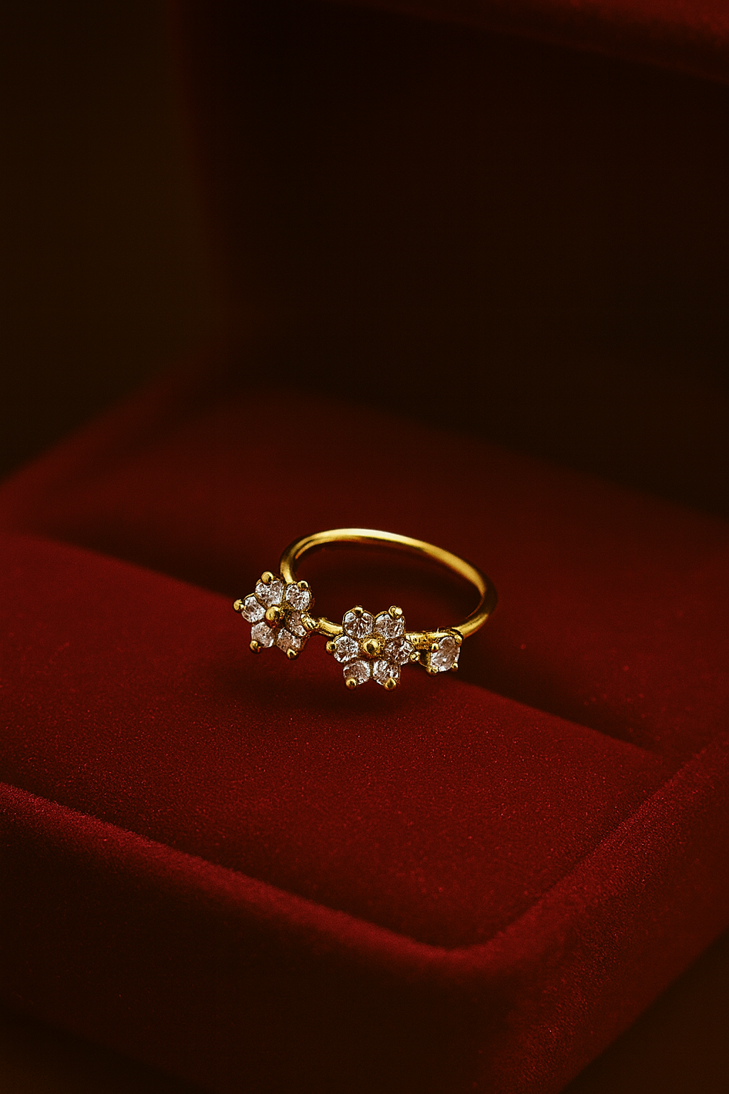 A delicately crafted gold nose ring adorned with floral-shaped sparkling stones, designed to bring elegance and charm to your look.