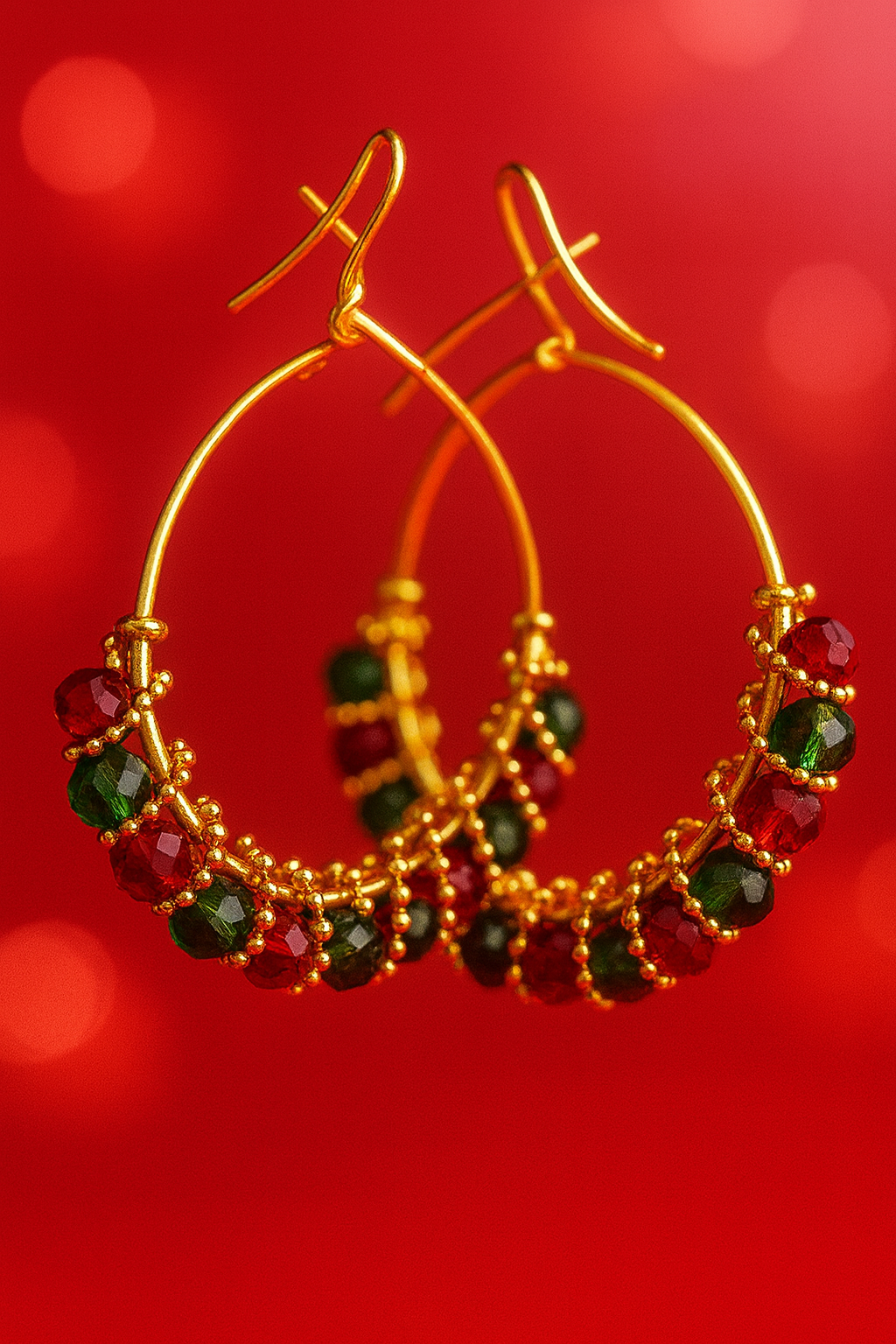 Gold-tone hoops featuring rich mehroon and emerald green beads for a timeless, festive charm.