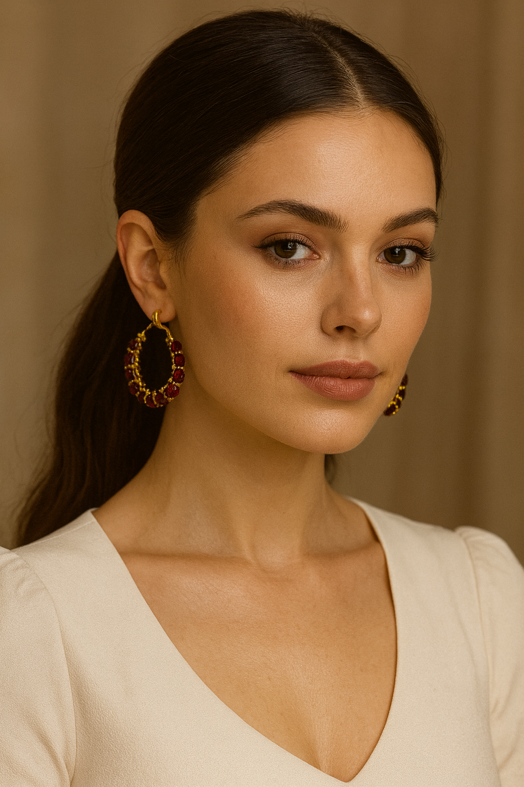 The Royal Maroon Beaded Hoop Jhumkas feature radiant golden hoops adorned with deep maroon beads, adding an elegant and traditional charm to any outfit.